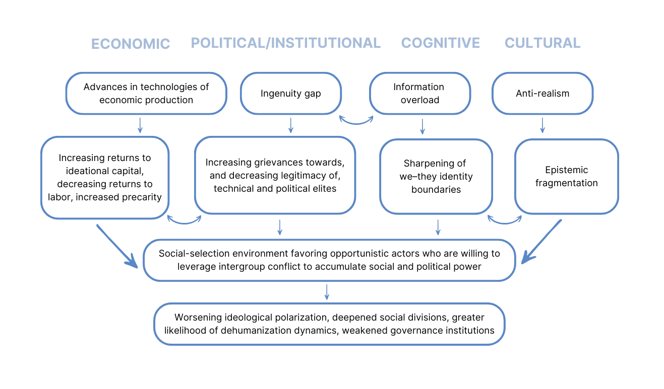 Each of the diagram’s vertical columns describes a proposed causal pathway that we believe is contributing to worsening ideological polarization, social division, and conflict. From left to right, we label these pathways economic, political/institutional, cognitive, and cultural.